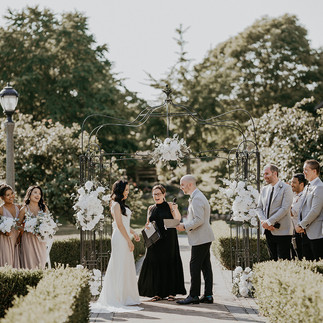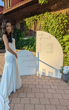My romantic contemporary wedding takes place at a historic venue nestled on the University of Toronto Scarborough campus. Originally built in 1931 as the Miller family’s summer residence, the charming house features exquisite stonework, intricate woodwork, and a magnificent garden, creating an enchanting setting for a memorable celebration. The décor is highlighted by simple, elegant floral arrangements in soft white and green, complemented by dried flowers on the table scapes to enhance the venue’s natural beauty. Wedding signage blends contemporary sans-serif fonts with romantic, delicate cursive, unifying all elements of the design for a cohesive and sophisticated atmosphere.